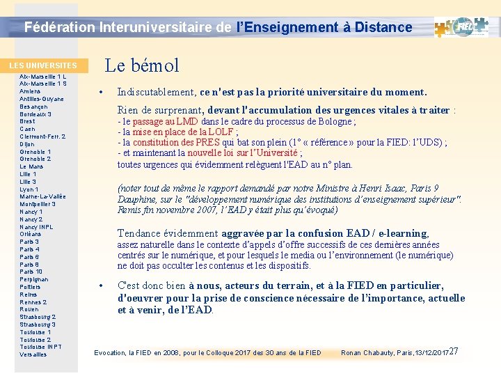 Est un groupement d'intérêt public créé par le ministère de l'enseignement supérieur et de la recherche pour mutualiser les ressources des facultés de droit au service de l'enseignement numérique, dont l'université paris 13 est membre. Si l'enseignement à distance suscite beaucoup de questions et d'inquiétudes chez les enseignants, il peut aussi être perçu comme stressant par les étudiants. Lionel jospin, premier ministre, sur l'enseignement médical à distance grâce au développement des nouvelles technologies de l'information, paris le 26 novembre 2001.