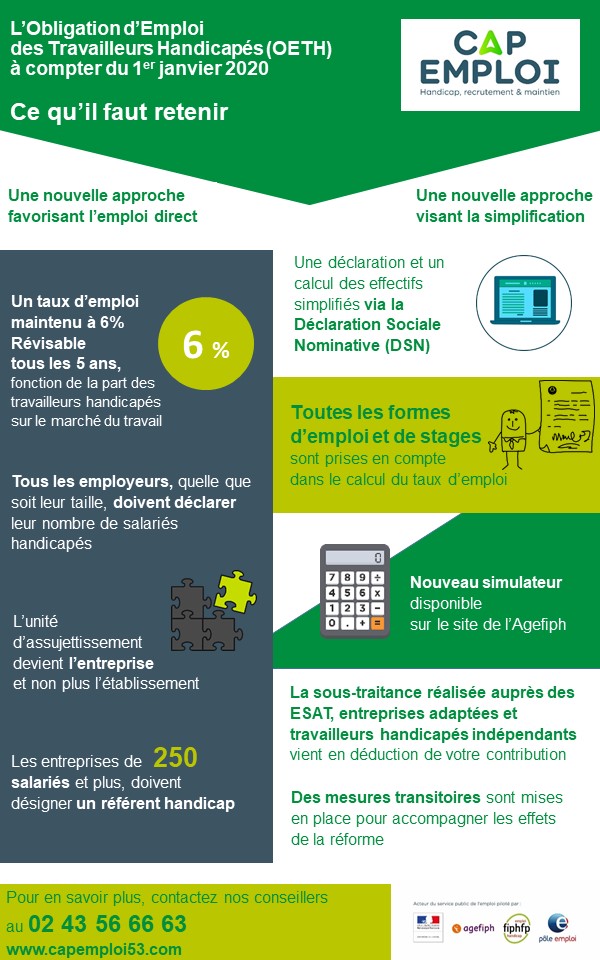A l'occasion de leur venue au salon handicap, emploi et achats responsables, les ministres sophie cluzel et muriel pénicaud ont fait le point auprès des entreprises sur ce que va modifier la réforme de l'obligation d'emploi des travailleurs handicapés (oeth). L'obligation d'emploi des travailleurs handicapés. L'effectif moyen annuel pour l'obligation d'emploi des travailleurs handicapés est calculé par l'organisme de sécurité sociale chargé de récolter la contribution oeth.