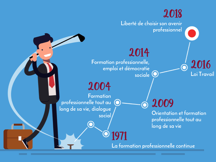 C'est en 1971, par la loi delors du 16 juillet, que sont fixées les règles de la formation professionnelle continue. Elle s'inscrit dans le cadre du second axe de la réforme sociale défendue par emmanuel macron, après les ordonnances réformant le code du travail. la loi du 24 novembre 2009 dont l'objectif est d'améliorer l'orientation et la formation professionnelle tout au long de la vie a été publiée au journal officiel le 25 novembre 2009 après avoir été déclarée conforme à la constitution par le conseil constitutionnel (décision du 19/11/2009) et est donc en vigueur depuis le 26 novembre 2009. Pas de lois, pas de progrès ! Le plan de développement des compétences